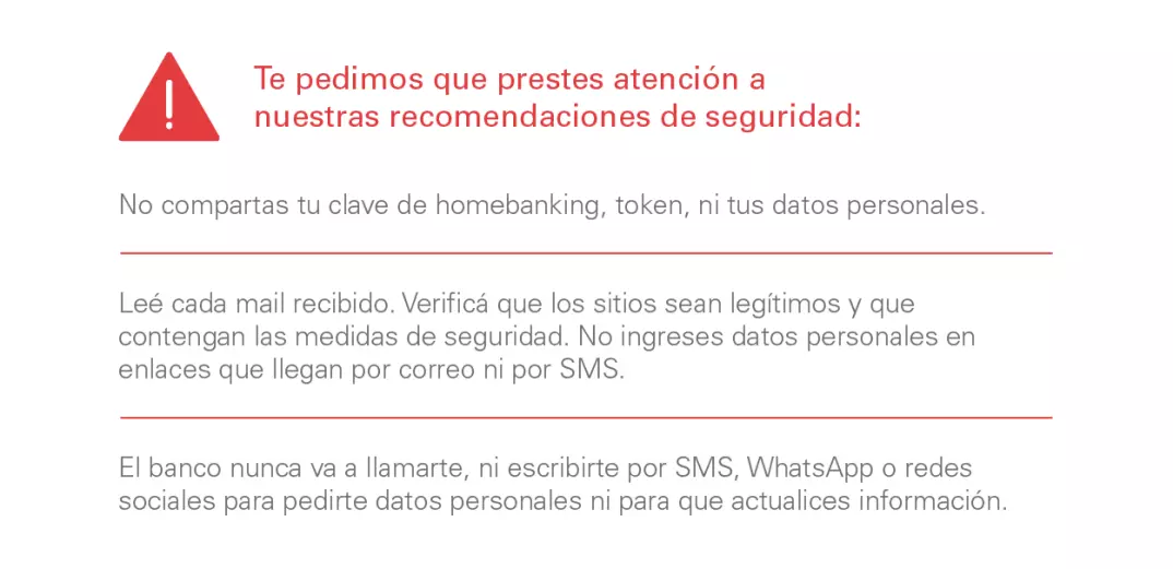 Recordá, El Banco nunca te solicitará tus claves o información personal vía e-mail, SMS ni telefónicamente bajo ningún concepto