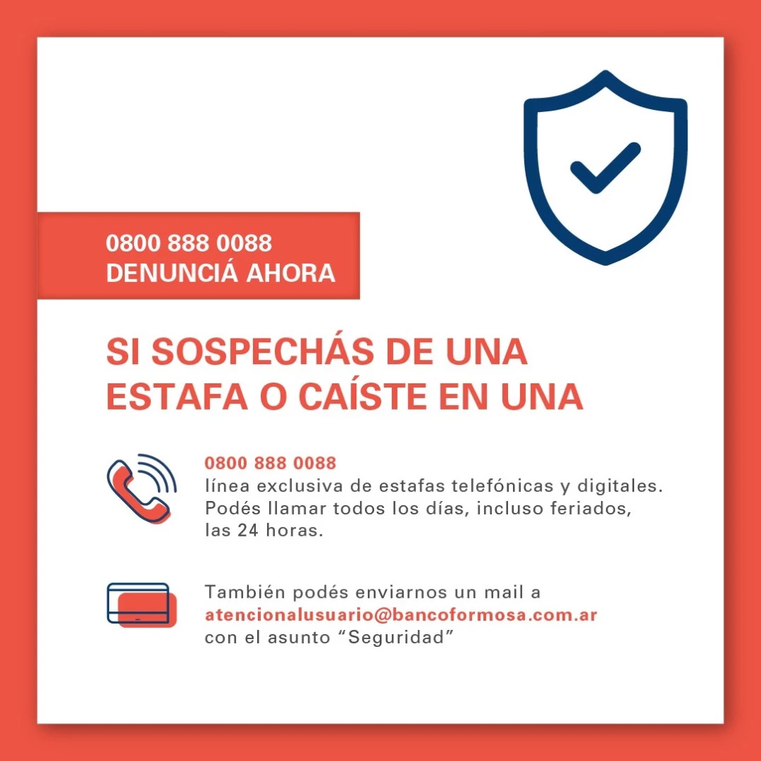 Si recibís un llamado telefónico o e-mail solicitando información personal, no lo respondas e informalo inmediatamente al Banco.